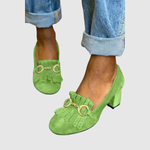 Te obcasy łączą żywe kolory z eleganckim złotym zapięciem i dekoracyjnymi frędzlami, tworząc stylowy i nowoczesny wygląd. Stabilna podeszwa zapewnia komfort przez cały dzień, podczas gdy design sprawia, że buty są idealne zarówno na co dzień, jak i na specjalne okazje. Idealna równowaga między kolorową energią a klasyczną elegancją.