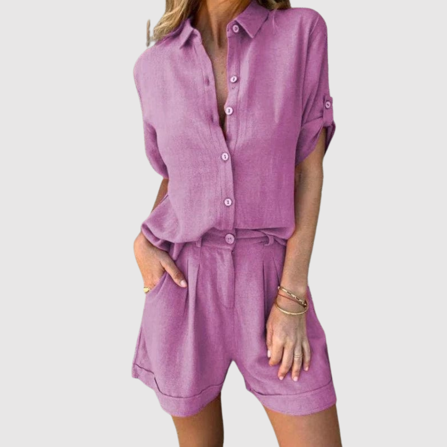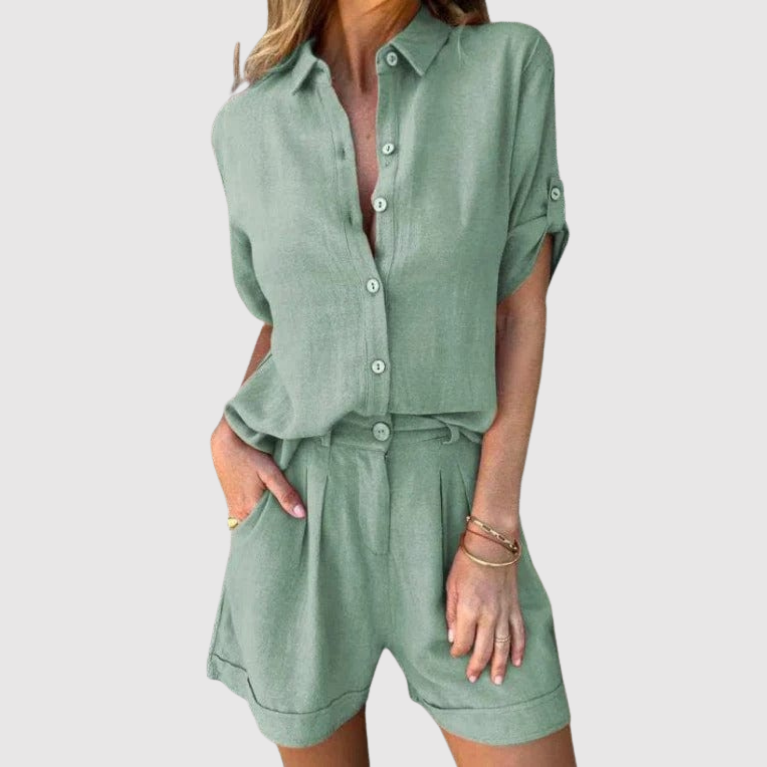 Lekki i przewiewny komplet, składający się z luźno stojącej koszuli i pasujących szortów. Zaprojektowany na gorące dni, kiedy komfort i styl idą w parze. Idealny zarówno na plażę, jak i na wieczorny spacer czy relaksujący dzień w domu.