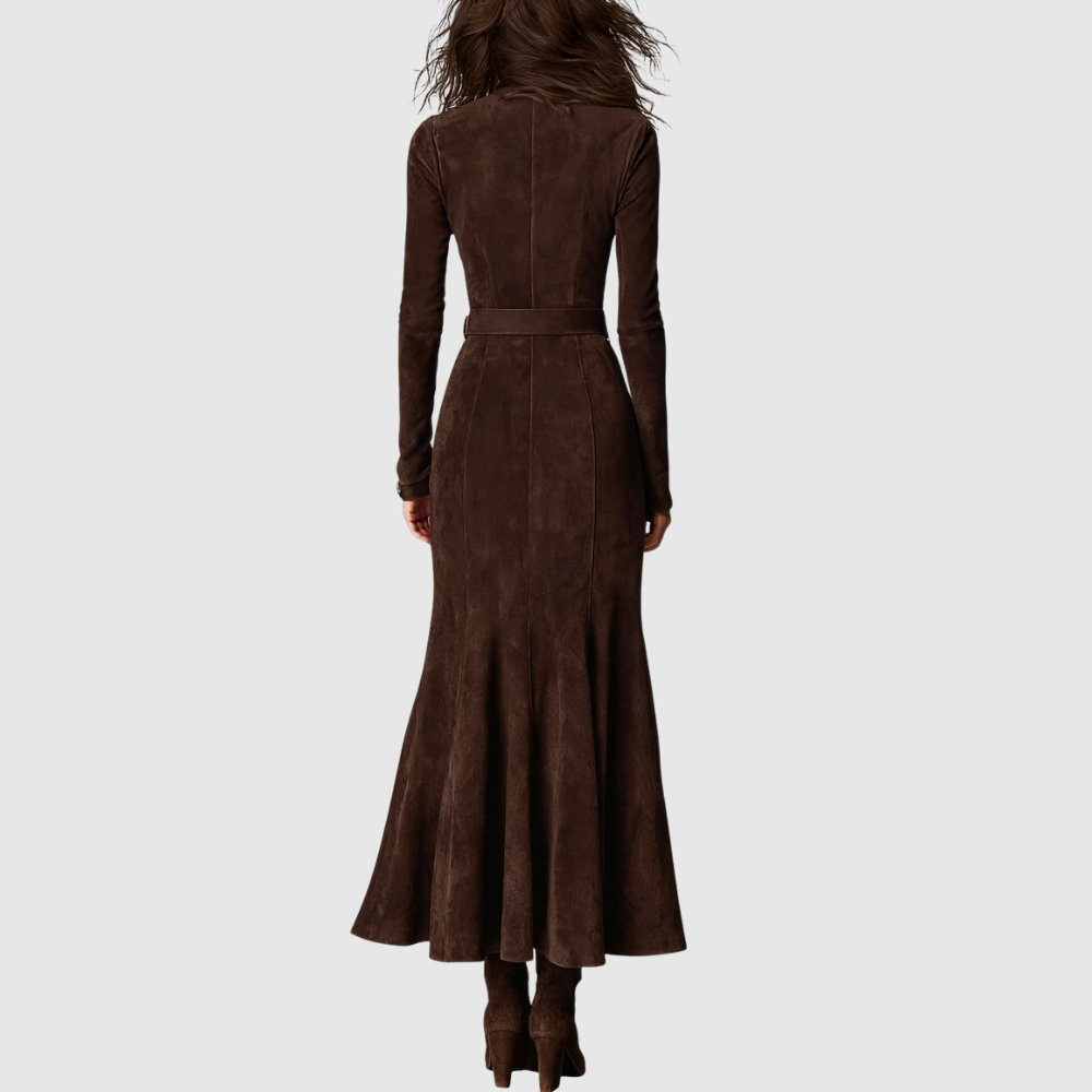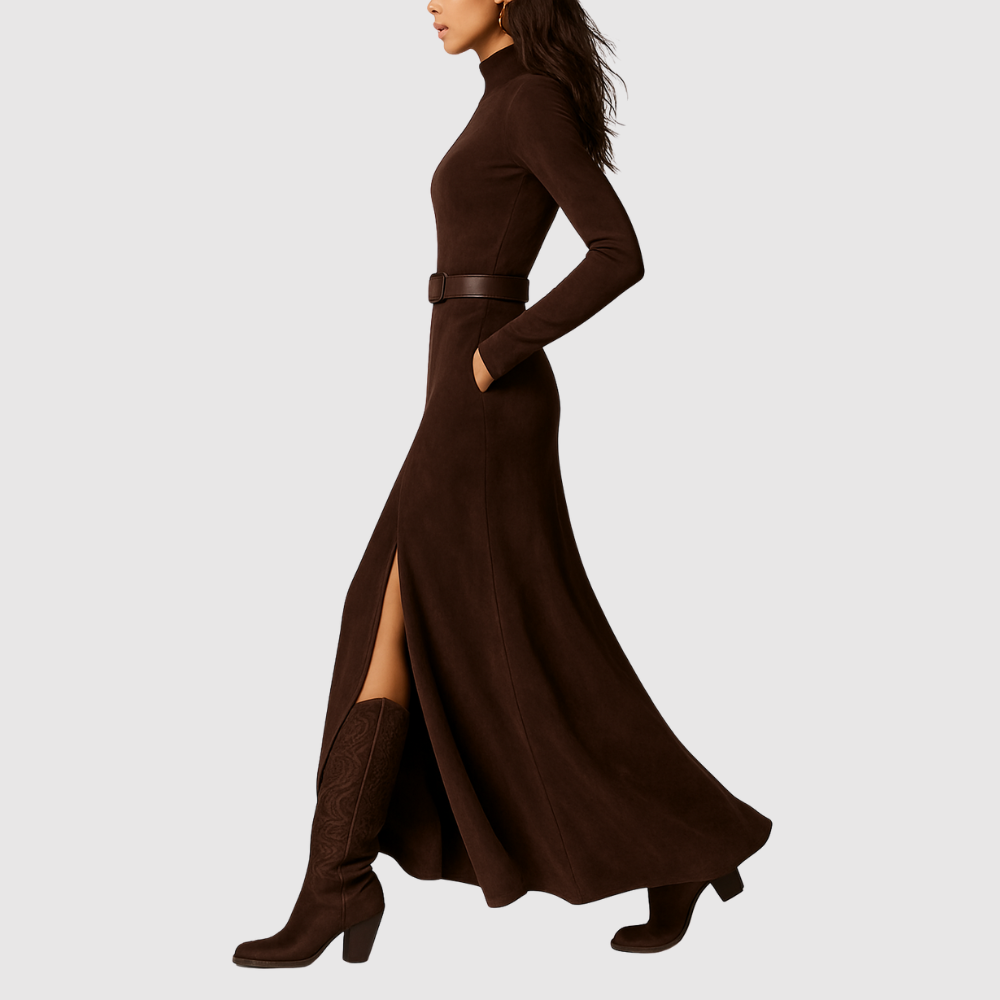 Ta długa sukienka łączy nowoczesny fason z lekko zmysłowym wykończeniem. Dopasowana góra subtelnie podkreśla talię, a rozszerzany dół nadaje całości lekki ruch. Idealna na jesień, zimę i wyjątkowe okazje, gdy chcesz wyglądać stylowo i kobieco.