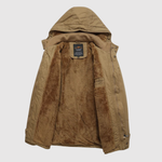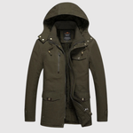 Ta kurtka zachwyca klasycznym designem i elegancką sylwetką. Wełniana podszewka zapewnia komfort i ciepło, podczas gdy pasek w talii podkreśla męską sylwetkę. Praktyczny kaptur dodaje funkcjonalności i ochrony w chłodne dni.