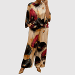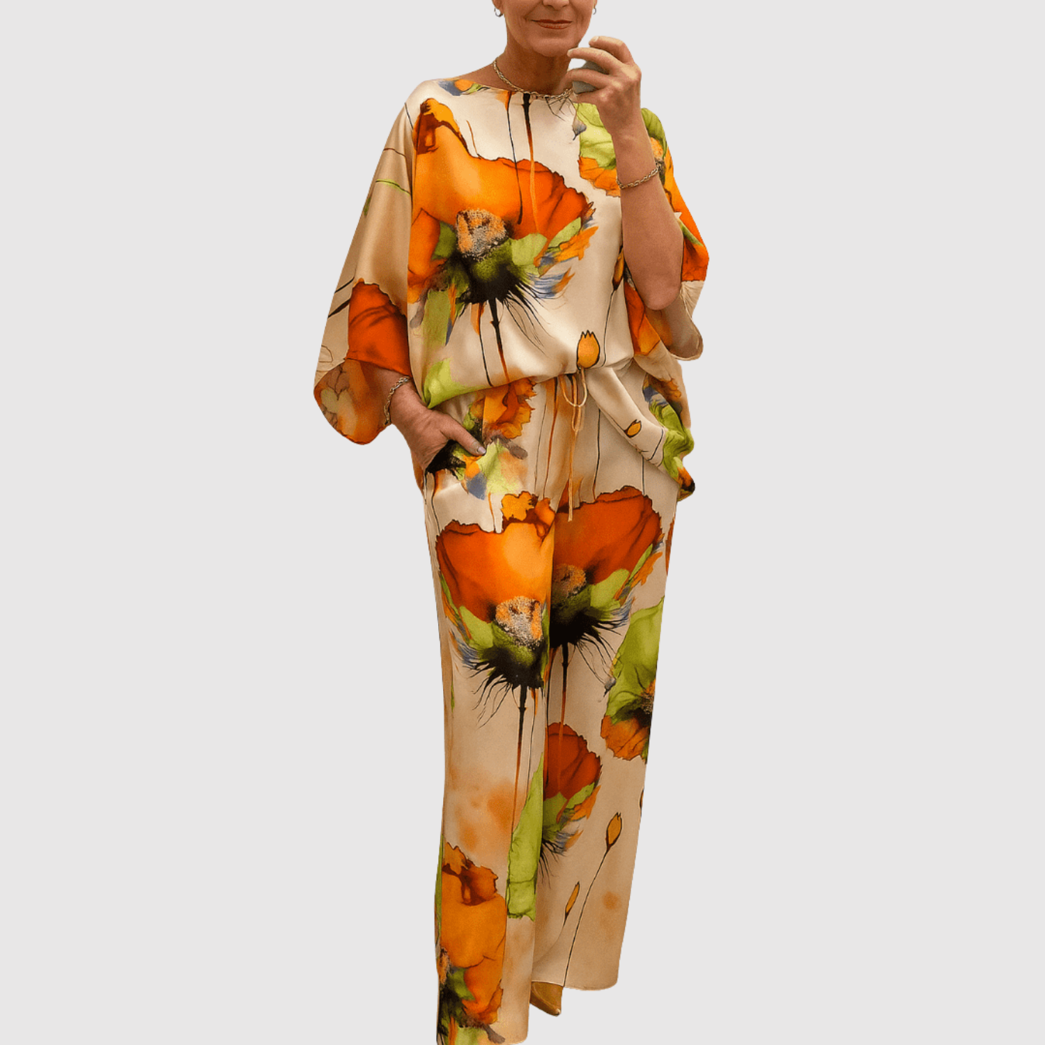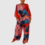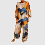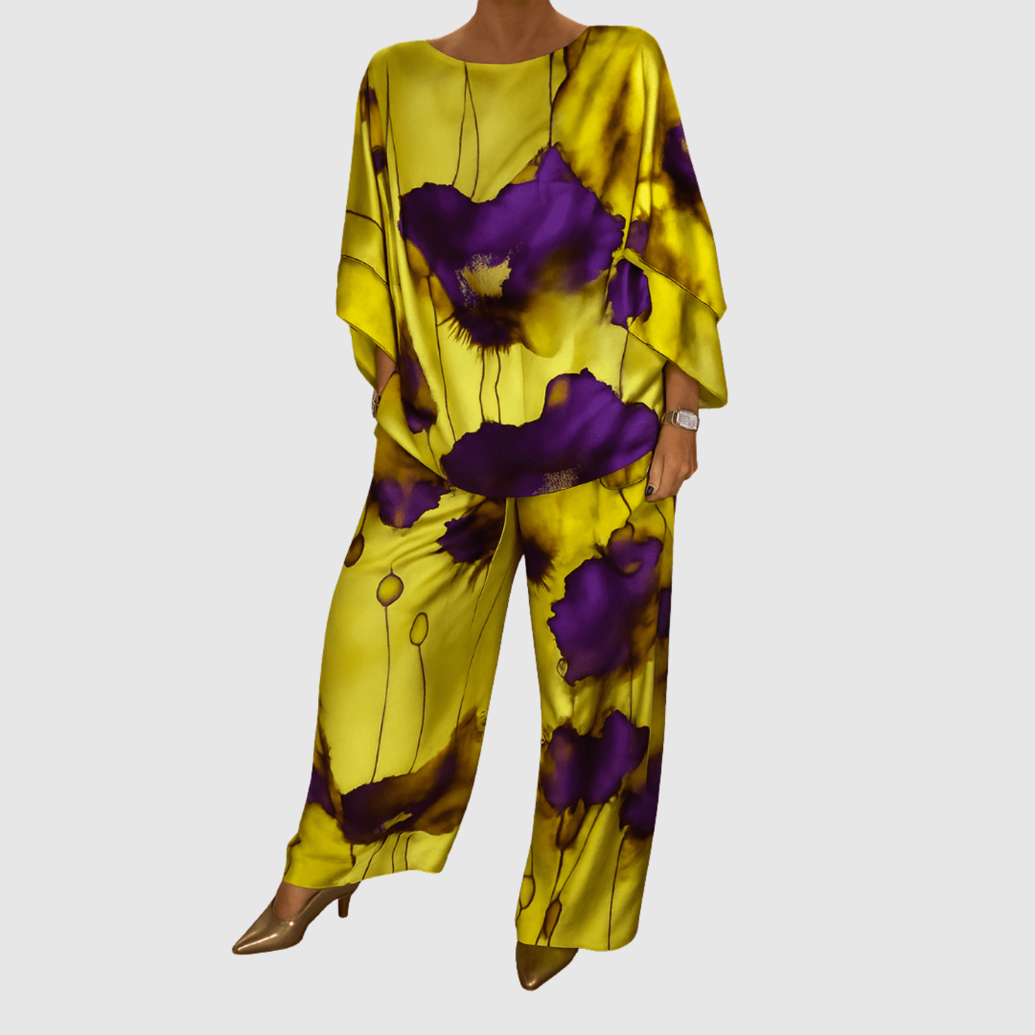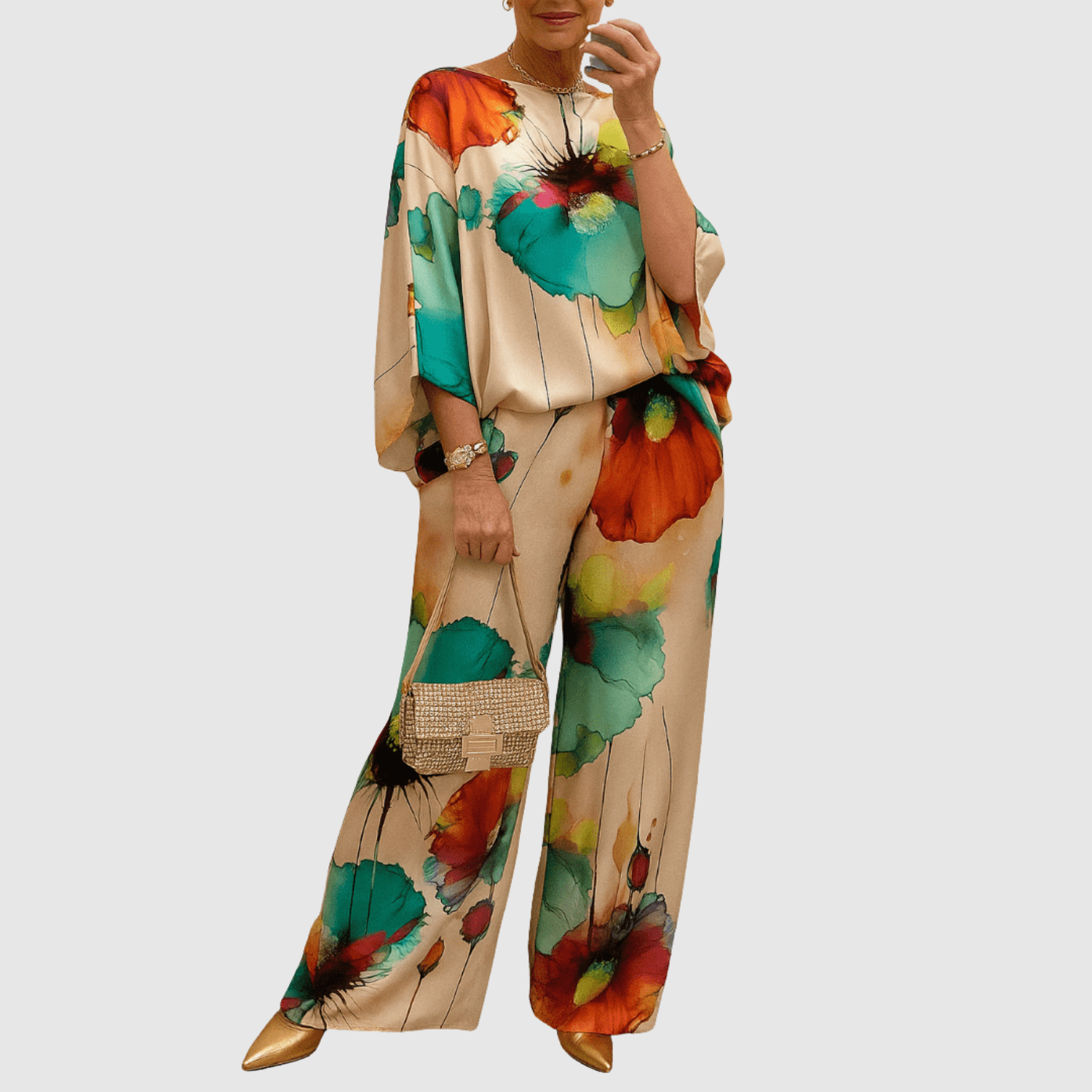 Luksusowy zestaw z satyny z płynącymi nadrukami akwarelowymi w żywych kolorach. Materiał jest miękki i błyszczący, co nadaje wyrafinowany wygląd, idealny zarówno na specjalne okazje, jak i na codzienne noszenie ze stylem. Dzięki wygodnemu krojowi i artystycznemu designowi, ten zestaw jest atrakcyjny.